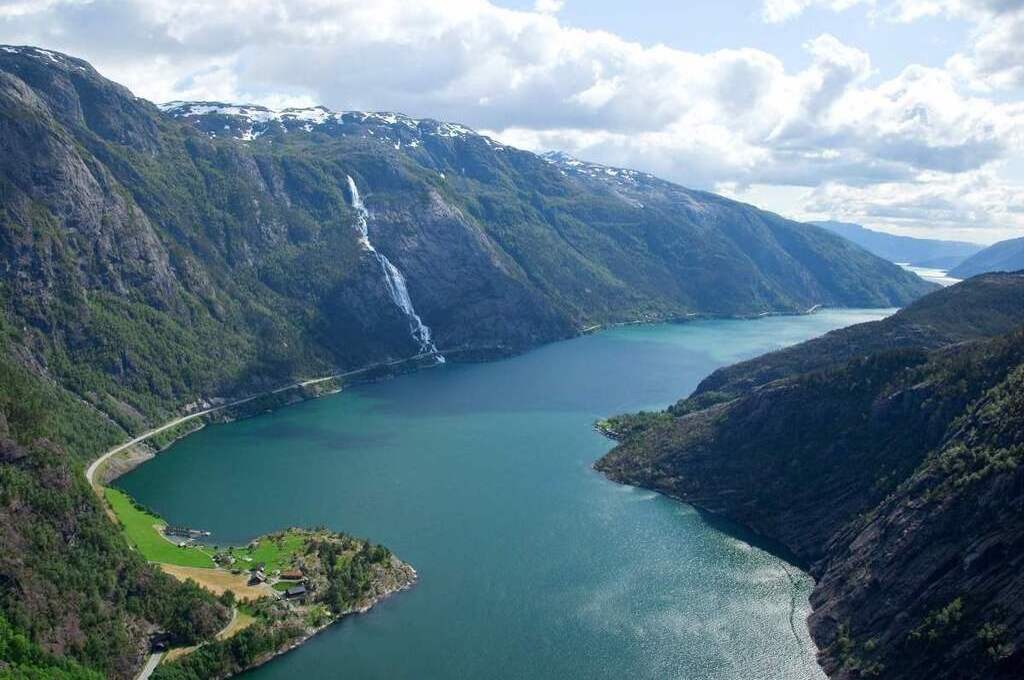 Mit einer Fallhöhe von rund 600 Metern stürzt das Wasser spektakulär in den Fjord hinab. Die Umgebung wirkt wie aus einem Märchen: steile Berge, unberührte Natur und die kraftvolle Energie des Wassers schaffen ein unvergessliches Erlebnis.